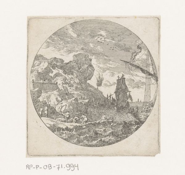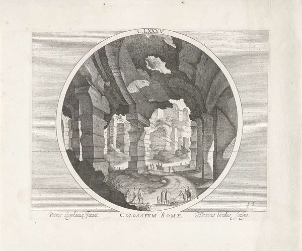 Editor: So, here we have Hendrick Hondius I’s engraving from 1600, “Baden van Dioclectianus, met toren," or Baths of Diocletian with a Tower. It has a slightly surreal feeling for me – ruins within this sort of...oval vignette. How do you interpret this work, particularly given the baroque style? Curator: Surreal is a lovely word for it. It's like a dream, isn't it? These prints weren't just about documenting reality. For Hondius and his audience, these classical ruins spoke of the grandeur of a past empire, a lost golden age that could fuel artistic and political ambition. The Baroque, you see, thrived on drama and emotional impact; what better stage than Rome's fallen monuments? Editor: That's fascinating! The drama is definitely there. The lines converging on the central tower almost make it feel unstable, despite being stone. Curator: Precisely! And what about the human figures? Dwarfed by the landscape, yet present. Perhaps we’re being prompted to reflect on the human condition amidst all this faded glory? Also, what do you make of the fact that the artist decided to show how they achieved the linear perspective on the top? Does it distract, or add an extra element of interest to the work? Editor: It's definitely thought-provoking. Showing his work like that adds another layer to the piece; he's not just depicting a scene, but revealing the process. I don't mind the choice; to me, it complements that idea that Baroque thrived on a kind of complexity, didn't it? Curator: Yes! What began as technical documentation evolved into something so much more resonant, with enduring allure! So the 'mistake' becomes a method. Perhaps art's greatest discoveries happen this way. Editor: It makes you wonder what future generations will make of our "mistakes" doesn’t it? Thanks, that’s been super interesting.