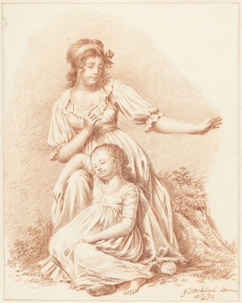 Editor: Here we have Thomas Burke’s portrait of Lady Rebecca Northwick and her daughter, Anne Rushout, from around 1780 to 1790. It’s a drawing, quite delicate. It feels very staged, very formal. What stands out to you about this piece? Curator: Ah, staged like a theatre piece, perhaps? Indeed, it does carry that air. What fascinates me is the dance between formality and intimacy. Lady Northwick presents herself with poised elegance, a representative of her station. Yet, there's a subtle tenderness in how she rests her hand on young Anne. Do you sense it? Editor: Yes, I see it! It's a sweet gesture amidst all the formality. But is there something more in their gestures? The daughter looks a little bit…disengaged. Curator: Precisely! A perceptive eye you have. Look at the garland, almost an offering, and yet the girl's gaze seems to drift elsewhere. This piece is made during the neo-classical era: do you see how the garments loosely draw the classic idealized forms of ancient sculpture? The picture then makes me reflect: are we observing a mother presenting her daughter to society, whilst the daughter longs for a freedom the garland itself suggests? I might be entirely off, but that's the delightful thing about art, isn’t it? Editor: I like your perspective. The garland as a symbol of freedom... I hadn’t considered that. Curator: Well, in art, as in life, it’s the unseen garlands, the untold stories, that often captivate the most. Editor: Definitely. It makes you think beyond just a pretty picture, doesn’t it? Thanks for the insight!