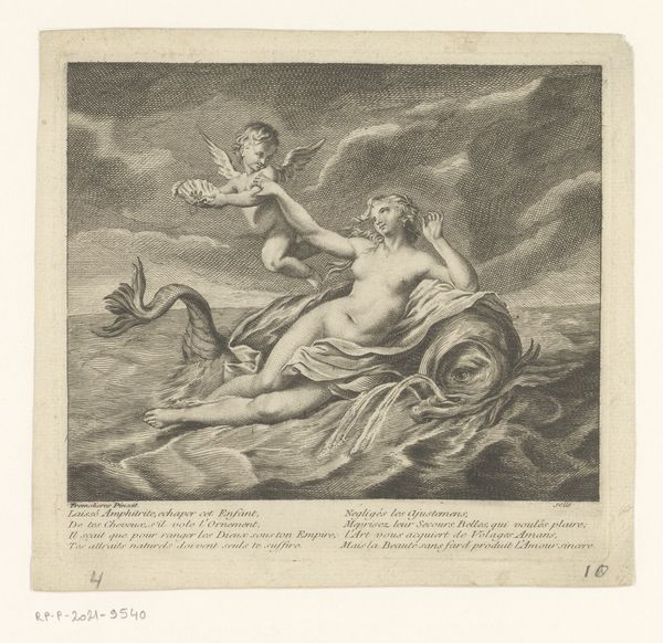 Curator: My initial thought is...whew! What a scene! There’s so much contained passion barely held back in this small artwork, don’t you think? Editor: Yes, a definite sense of urgent motion, even alarm. What you're seeing is William Hamilton's "The Abduction of Deianira," a watercolor drawing and print from around 1770 to 1780. The work depicts a moment ripped from Greek mythology. Curator: Hamilton's grasp of watercolor, well, it's not quite Turner, is it? The centaur, what power, but also... oddly tender? Despite the violent act depicted. Is she struggling enough? Or is she enjoying the ride? Am I the only one who senses mixed emotions? Editor: The classical abduction myth, especially through a late 18th-century lens, always provokes complex readings. Power, desire, violence... they’re inseparable here. The male gaze, literally and figuratively, constructs the female body in distress. How does the composition reinforce these themes, do you think? Curator: The flowing landscape accentuates that breathless feeling, the sky a swirling backdrop that pushes our focal characters front and center. Deianira seems resigned, yes, as she arches away while being hauled over the river. Meanwhile the rippling current below practically shouts movement, urgency, an escape route! Though, will they manage? Editor: It's fascinating how Hamilton merges romanticism with this history painting, setting up tensions around gender, agency, and spectatorship. It isn't just a historical scene; it’s a lens for analyzing power structures and questioning romantic ideals. I wonder how Hamilton’s audience might have viewed this depiction differently. Curator: Perhaps through purely romantic ideals. Chivalry! Danger! Damsels! But your ideas, they cut deeper... perhaps they looked at the image with less clouded perspectives. So, yes, perhaps this small drawing packs more of a subversive punch than I originally saw. Thank you for clearing the dust! Editor: And thank you for spotlighting the artist’s compositional and emotional complexity. Every brushstroke contributes to a conversation that spans centuries and speaks directly to today's audiences. Let’s think about who is seeing whom and from which position...