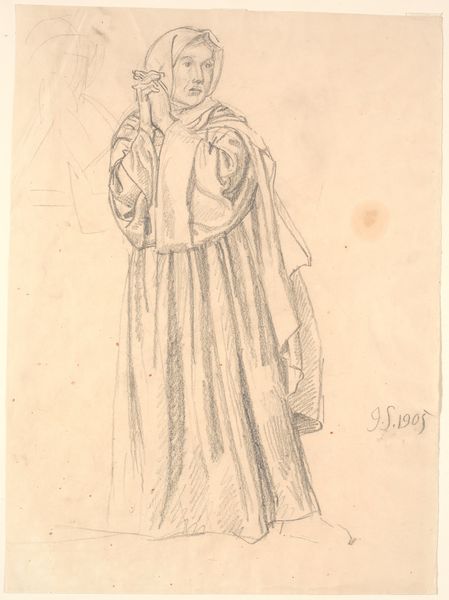 Curator: Let’s spend a few moments with this intriguing sketch by John Singer Sargent, "Study for 'Dogma of the Redemption: Frieze of Angels' [verso]," created between 1895 and 1903. Editor: It has such a stark, almost haunting quality to it. The figure appears trapped or confined, presented in the form of this graphite sketch on a very aged paper, hinting to themes of limitation. Curator: That sense of confinement speaks volumes. Sargent was commissioned to create murals for the Boston Public Library, and this study unveils a fragment of his larger narrative around religious dogma. The figure holding what appears to be a ladder has its role defined by religious narratives and academic practices. Editor: I’m really drawn to how the simplicity of the pencil brings forward the figure's garment. There’s an interesting contrast between the softness of the clothing's depiction and the harsh lines of what I think might be a rack. This could tell something about the labour and techniques employed. The physical act of drawing, repeatedly going over the same lines... it's like Sargent is literally working through an idea. Curator: Absolutely. The process reveals Sargent grappling with complex theological ideas in a public space. These murals had to resonate with Boston's elite, thus, the artwork shows Sargent aligning his aesthetic with acceptable portrayals for the cultural institutions of his era. Editor: This almost feels like Sargent is inviting the viewer to see the material and the conceptual being reconciled in the artwork, where an artist’s private reflections become a large civic statement about religious devotion. I also appreciate the visible marks of creation. Curator: I agree, observing the materiality makes it far more profound. Thanks for highlighting that perspective. Editor: And thank you, learning of the social and religious influences surrounding Sargent’s work has further helped bring new light to this work!