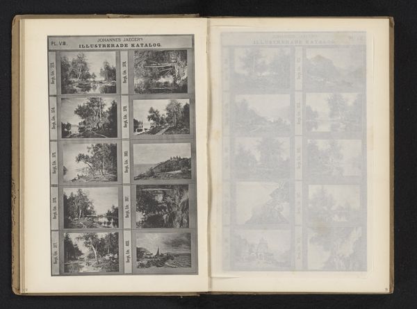 Curator: I am struck by how muted and evocative this image is despite its size. There is something really haunting about the landscapes, almost Romantic in feeling. Editor: Indeed. What we're looking at here is titled "Fotoreproductie van tien schilderijen van landschappen en watergezichten met boten," a photographic reproduction of ten paintings showcasing landscapes and waterscapes with boats. These prints were produced sometime between 1872 and 1882. The images, arranged as in a catalog, offer a view into the landscapes that capture, and even produce, a particularly sensitive rendering of place. Curator: I find the image a little ambiguous, too. Are these ten paintings necessarily a coherent group or set? There are ten images grouped on each spread. What visual or intellectual relation binds them? Editor: A question that goes straight to the heart of how we classify art in the museum space, doesn't it? The piece brings to light that very curatorial desire to organize and categorize. Given the catalog nature, they might have just been landscapes available for sale by the artist. The choice of subjects evokes Dutch Golden Age landscape painting, with that concentration on specific places within the artist’s contemporary landscape. Curator: It definitely makes me wonder what kind of statement the artist Jaeger was hoping to make by capturing landscape and waterways together. Editor: Considering it's a photo reproduction, that intention could lie as much with Jaeger, the seller, as the original painters. What statements can be made from curating ten landscapes in one overview like this? In a way, Jaeger makes visible the very principle and effect of collections of art in general. It is a reminder that no one of these small landscapes carries much weight; it's through the multiplication and presentation that they accrue significance. Curator: Absolutely. In its emphasis on representation and context, the photograph serves as a critical, and perhaps self-reflexive, demonstration of value in catalog form. A meta-commentary about art's societal role! Editor: Exactly, it provides insight into the art market and how images circulate and accumulate worth, and our perception of artistic worth through the dynamics of the image as art, as document, and as cultural sign. Thank you for pointing to these connections! Curator: And thank you for sharing that larger art historical and institutional context!