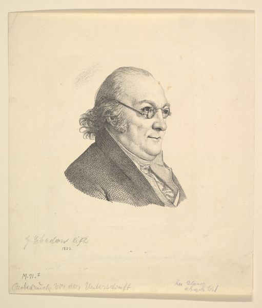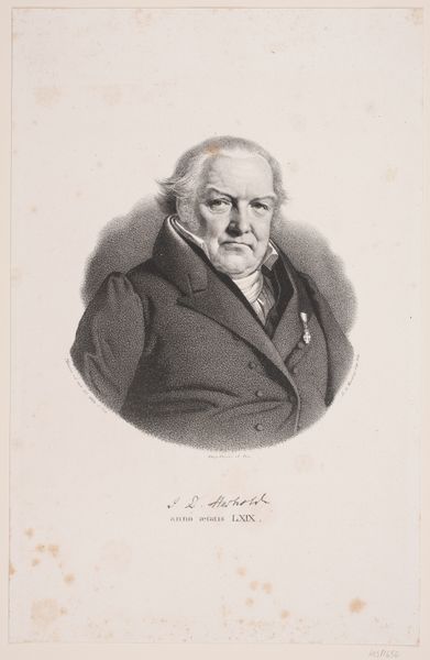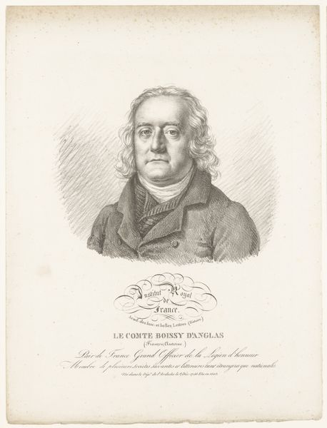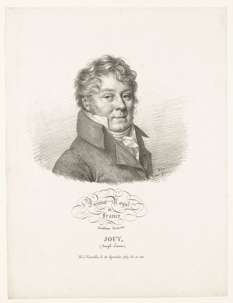 Editor: This is Julien-Léopold Boilly's 1822 engraving, "Portret van de dichter Antoine-Vincent Arnault." It's strikingly academic, in the Neoclassical style... I am struck by its simplicity, almost severity. What do you see in it? Curator: Simplicity indeed. Think of this engraving as a kind of… echo. Echo of a world steeped in revolution, of shifting powers and cultural rebirths. I imagine Boilly, with each deliberate stroke, capturing not just Arnault’s likeness, but the weight of his words. The crosshatching almost feels like he's capturing the intellectual ferment of the time! Editor: I hadn't thought of the crosshatching that way! It almost seems photographic in detail, yet so restrained. Do you think Boilly intended this sense of… gravitas? Curator: Intention is a slippery fish! But I sense he aimed for an image that balanced public dignity with the intimacy one finds in poetry. Think about what it means to engrave a portrait. Each line is considered, not impulsive. And Antoine-Vincent Arnault was not just any figure. How might you, as an artist, portray a man celebrated for language, reason and membership to the Legion of Honor? Editor: You're right, there's definitely an effort to capture a certain level of authority and intellect. The inscription underscores that. Perhaps more successful in conveying gravity than say... personality. Curator: Perhaps! Which makes me think, whose responsibility is that anyway? The sitter or the artist? Boilly leaves us with a quiet, almost haunted contemplation on not just Arnault as a subject, but portraiture itself! Editor: Fascinating! So, this engraving prompts questions about how we represent intellect and importance visually, more than offering definitive answers about Arnault himself. Thanks! Curator: My pleasure. Art invites us to question, and thankfully, seldom dictates what we ought to believe.