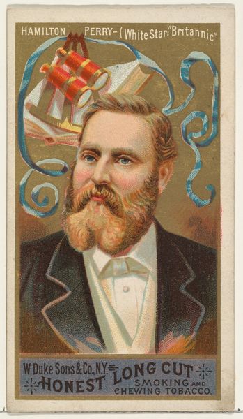 Curator: This print, a promotional card from 1887, depicts Henry Condron of the "City of Chester," part of the "Sea Captains series" by W. Duke, Sons & Co., used to market their "Honest Long Cut" tobacco. I immediately find the caricature both charming and evocative of a certain era. Editor: I'm struck by the composition. The central portrait, framed by a simple circular vignette, creates an immediate sense of focus and authority. The colors, however, are a bit muted. Perhaps an intentional choice to align with the period aesthetic? Curator: Likely so, although the vibrant red of the flag is hard to miss, isn’t it? Notice how it positions Condron in relation to a specific maritime enterprise through symbols. Red, historically a sign of authority or wealth, further alludes to Condron’s status and is also used prominently on the man’s rosy cheeks. The name “Inman,” presumably the shipping line, also sits along the banner with an unknown “I & I”. Editor: The use of that vivid red is intriguing, especially juxtaposed with the somewhat desaturated background. And your point about maritime symbols raises an important structural point. It creates a clear hierarchy of visual information, doesn’t it? First, we see the man, then the signifiers of his profession and the overall brand. The eye moves quite deliberately from figure to context to commodity. Curator: Precisely! Tobacco cards of this type not only memorialized figures of maritime power but also, maybe subconsciously, celebrated an almost mythical masculinity associated with the sea—a cultural force intertwined with global trade and the distribution of commodities, including tobacco itself. There’s continuity here linking image and the tobacco that this print sought to sell. Editor: Absolutely, but what is also being displayed here is advertising for tobacco products that, even in this format, present very precise graphic-art elements meant to attract potential customers: the colors, shapes, balance of foreground/background and also, as you say, the personification of the rugged ship captain that is now directly connected to, even validated, by his association with smoking and chewing “Honest” Long Cut. Curator: Food for thought, indeed, the artwork invites us to delve deeper into the history of advertising and visual culture and what that means for commerce, both then and now. Editor: A fitting example of the enduring dialogue between art, commerce, and cultural perception.