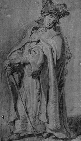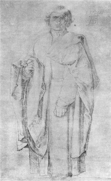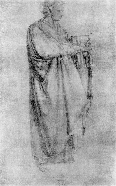 This drawing of an apostle was made by Albrecht Dürer in 1523. The composition centers on a figure rendered in nuanced shades of gray, achieved through delicate pencil work. The apostle is draped in a heavy cloak, which dominates the visual space, and a staff is held in his left arm. Dürer’s technique here is fascinating; his use of line and shading creates a compelling sense of depth. The apostle's cloak billows around him, giving the figure both weight and movement. The lines define the folds and create a sculptural quality, even within the two-dimensional medium. The apostle holds what appears to be a book, suggesting intellectual or spiritual authority. Consider how Dürer uses light to model the form. Light seems to emanate from the left, casting shadows that emphasize the figure’s volume. This use of chiaroscuro not only enhances realism but also adds a layer of drama to the scene. This emphasis on form invites us to consider how Dürer might have viewed the role of the apostle, not just as a religious figure, but as a figure of knowledge and resilience.