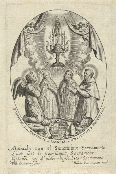 Curator: The image before us, "Drie-eenheid," or "Trinity," was completed in 1629. It is an engraving by Christoffel van Sichem the Younger and resides here at the Rijksmuseum. Editor: There's a remarkable clarity despite the density of lines. It’s as if light itself is being translated into palpable textures. The visual weight is carefully distributed—challenging yet balanced. Curator: Sichem’s commitment to line is evident, showcasing not just forms but a system of signification. Notice how the converging lines articulate a divine source of illumination—a formal embodiment of spiritual insight. Editor: And it is through the careful application of this "system," as you put it, that Sichem creates not just light, but also shadow. The labour involved in meticulously carving each line of the engraving cannot be ignored. What tools did Sichem have at his disposal to achieve such fineness? Curator: That labour translates, formally, to the symbolic: observe how each figure inhabits its own spatially defined sphere within the larger composition. It’s a sophisticated understanding of volume rendered through line. Note that in semiotic terms, light transcends from the Father through the Holy Spirit and graces the Son. Editor: And perhaps within this artistic production is also a story about religious patronage. Sichem likely relied on wealthy individuals who not only demanded this artwork, but also determined its iconography. I imagine that shaped Sichem's labor significantly. Curator: Precisely. Furthermore, Sichem has deftly deployed stylistic devices drawn from the Northern Renaissance, blending it with an evolving Baroque aesthetic. A truly sublime interplay between content and construction! Editor: And a potent reminder that the meaning of any artwork is rooted in both the vision of the artisan, and the specific demands of a patron; a true convergence. It underscores how materials and circumstances mold the artwork and its perception across the ages. Curator: Absolutely; seeing the construction of the image offers clarity in seeing its meaning. Editor: Indeed, every line has an intent—as has the process which creates that intent.