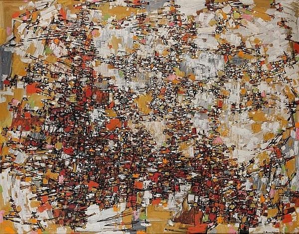 Curator: Welcome. We're standing before an untitled abstract painting by Bui Xuan Phai. It's painted with acrylic, and although undated, it is considered to be within his later works. Editor: Immediately, I’m drawn to the feeling of chaotic energy—a wildness tamed by structure. It feels like peering into the intricate workings of a complex clock or maybe an abstract city. Does it give you the same feeling? Curator: In many ways it does! It is not unusual that he would present works reflecting the social anxiety, constraint and perhaps urban confinement prominent under socio-political restriction in Hanoi at the time he produced these abstractions. Editor: Confinement definitely rings true. But then there's the almost joyful colour palette! Pink, blue, red dancing amongst black outlines. Are you telling me that the artist intentionally created dissonance between content and application? Curator: The painting becomes part of a political game where messages are communicated under duress but also through a vibrant explosion of patterns which becomes its own form of subversive social critique. The artist also had to rely on coded abstract communications simply in order to survive, artistically. Editor: What kind of commentary are you reading here—urban development? Cultural struggle? Something else entirely? To me, these structures feel like neurons firing, networks buzzing—almost internal. I have a curious feeling. It’s exhilarating! Curator: Exactly. So there’s something universally relatable happening here, about society in constant, hectic formation—it asks viewers to challenge perceived limitations on self-expression and resist being confined, artistically or politically. It may very well resonate with people on both local and universal levels. Editor: It's that resonance that keeps me hooked, makes me ask questions of this painting. Even though it's "untitled" and categorized as abstraction—the work vibrates, speaks! I find the title itself very funny considering all that it tells me, ha! Curator: That tension is vital to his creative statement! Art historians play their public role so that people learn that "abstraction" here can point back toward real conditions on the ground in Hanoi under particular historical conditions and the value of subversive art at large! Thank you for your input! Editor: It’s been an experience; thanks for yours! To think something "abstract" could still offer an urgent message. Food for thought.