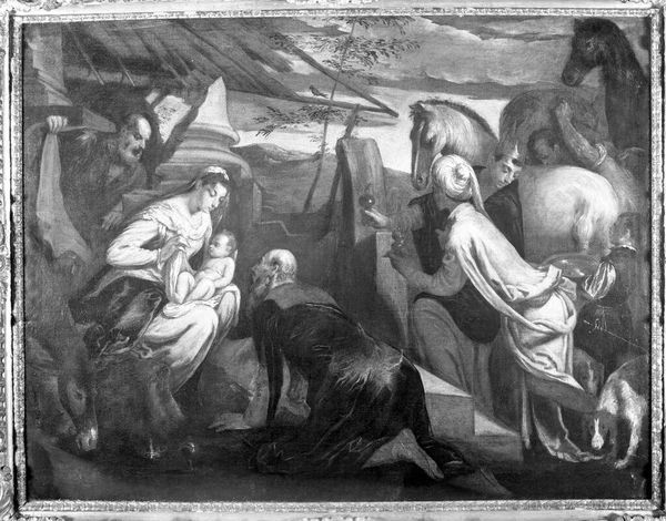 Andrea Sacchi rendered this oil on copper work, The Baptism of Christ. Its relatively small size contrasts with the grandeur of the scene. The composition is divided into earthly and divine realms. The lower half is filled with figures clustered around John the Baptist and Jesus, while the upper half dissolves into a swirling vortex of clouds. Sacchi uses light to unify these spaces, but also to differentiate them. Soft light bathes the figures, accentuating their sculptural forms. Above, a more diffused light filters through the clouds, suggesting divine presence. The painting’s structure employs a semiotic language rooted in Baroque aesthetics. The use of dynamic diagonals, the interplay of light and shadow, and the emotional expressions of the figures all come together in an attempt to transcend earthly limits, inviting viewers to consider the profound spiritual implications of baptism.