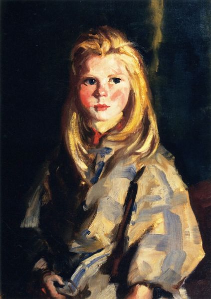 Editor: This is Robert Henri’s "Blond Bridget Lavelle" from 1928, an oil painting on canvas. I find her gaze incredibly striking. She looks almost contemplative, set against this really dark, undefined background, but what's going on? What's *your* first impression? Curator: Well, she appears self-possessed, doesn't she? Even vulnerable. Her expression hints at a hidden story, which, naturally, draws you in, wouldn't you agree? It feels very direct. And those strokes! See how Henri uses visible brushwork to give her presence, but almost with a restless energy? Do you get that sense? It feels like an observation from life rather than an idealized depiction, doesn’t it? Almost spontaneous. The shadows across her face are pretty dramatic. Editor: Absolutely. It's almost as if Henri wanted to catch a fleeting moment, but...was it ever considered incomplete at that time because of that unfinished, painterly effect? Curator: You're onto something! The modernists of the era celebrated that loose style. They saw the artist's hand as part of the beauty. It emphasized authenticity, experience, in a way academics had resisted. Before, artworks tried to hide evidence of being 'made'. This era went for the 'reveal'—the real! It mirrors how people began understanding that imperfection IS the point. What do you take away from that idea, particularly from the point of view of someone just embarking in this journey? Editor: That imperfections are not to be hidden! I now see so much movement and life. It definitely made me see her beyond a pretty portrait. Curator: See how Henri invited you to question yourself? Works for me.