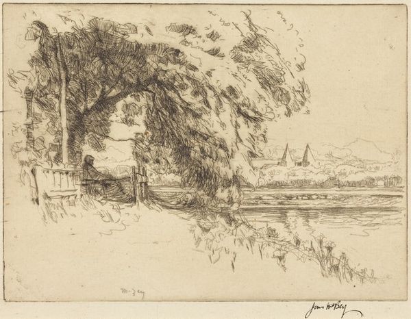 James McBey etched "The Towy at Carmarthen", capturing a scene along the River Towy in Wales. Born in Scotland in 1883, McBey's experiences as a self-taught artist shaped his unique vision. This etching presents a serene landscape, but it also subtly engages with themes of identity and place. The lone figure on horseback can be seen as embodying a sense of belonging and connection to the land. McBey himself was deeply attached to the landscapes he depicted, often finding solace and inspiration in nature. The image evokes a sense of quiet contemplation. It invites us to reflect on our own relationships to the spaces we inhabit, as well as the emotional bonds that tie us to particular places. It reminds us that landscapes are not just passive backdrops, but active participants in shaping our identities and experiences.
