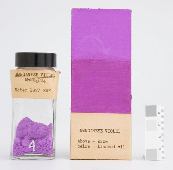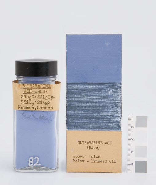 Curator: Here we see Manganese Blue, produced by Stanley Doggett. It presents a striking blue pigment in both its raw powder form and as a painted swatch. It's captivating, isn't it? Editor: It's incredibly evocative. The pure pigment housed in glass beside its application makes me think about the means of production and the labour involved in creating just this one vibrant shade. Curator: Absolutely. And consider the cultural implications, the historical moment when this synthetic colour emerged, impacting artists' palettes and visual culture. Editor: And how different artists' access to the colour altered the landscape of art production. It really prompts one to consider the materiality and the social impact of this colour. Curator: I agree, seeing pigment in its pure form really opens up a critical dialogue about art-making. Editor: Indeed. It all comes down to the means by which art is produced, and the consequences thereof.