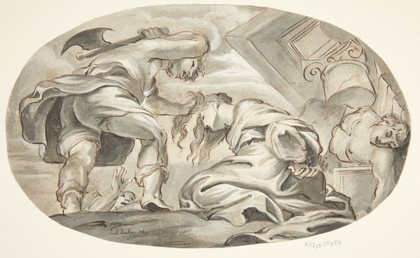 Editor: This drawing, "Man in monnikspij kruipend met schoffel" or "Man in Monk's Robe Crawling with Hoe," was made in 1914 by Jac Jongert. It’s rendered in ink, and there’s something about the stark lines that makes it feel both ancient and modern at the same time. What’s your take on it? What do you see in this piece? Curator: The starkness you perceive points to the tensions of the early 20th century. Jongert created this during a period of intense social and political upheaval. How might this image of a crawling, robed figure, seemingly engaged in menial labor, speak to anxieties around social hierarchies and religious authority? Editor: That's a fascinating angle. I hadn’t really considered the social commentary. I just saw him as, well, working! Curator: Exactly. The beauty of art lies in its layered meanings. Notice the deliberate symbolism – the floral border contrasts with the hunched posture. The crawling man evokes not just labor, but perhaps a forced submission. Are we looking at piety, penance, or something more critical? Jongert positions him in such a way. How does the medium—ink—itself contribute to this discourse? Editor: I see what you mean. Ink lends a permanence, but here the lines almost seem tentative, adding to that sense of unease. The floral patterns soften the image somewhat, so there is hopefulness mixed with drudgery. Curator: Precisely! Jongert uses this tension to provoke questions. He uses the monastic figure – removed from societal action – to invite reflections on spirituality versus social action during a time of growing socialist movements. Editor: Wow, I'll never look at a monk with a hoe the same way again. Thanks, this has made me see art as not just visually interesting, but as a mirror reflecting complex societal tensions. Curator: My pleasure. It is through that active engagement that we learn and begin to effect change through a deeper cultural understanding.