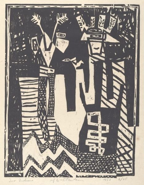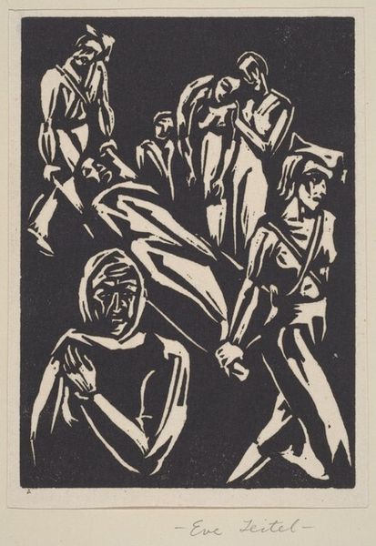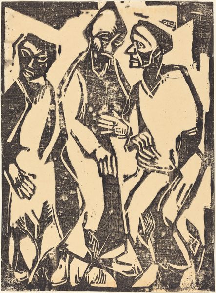 Max Pechstein created this woodcut titled 'The Mirror' in 1922. The stark contrast of black ink against the paper immediately captures your attention, highlighting the angular forms and simplified shapes. The print depicts two women, one gazing into a mirror, rendered with bold lines and flattened perspective. The composition is structured around dynamic interplay of positive and negative space. Pechstein uses the woodcut medium to its full potential, carving thick, expressive lines that define the figures and objects. Note the way the artist employs the formal reduction of Expressionism, focusing on the emotional impact of the scene rather than representational accuracy. The rough texture and visible grain of the wood further enhance the artwork's raw, emotive quality. Consider how this print engages with the Expressionist movement's broader concerns. The artwork reflects anxieties about identity, representation, and the self in the modern world. The mirror here acts as a signifier, not only reflecting an image but also questioning the very nature of perception. As such, it challenges viewers to confront the complexities inherent in seeing and understanding ourselves.