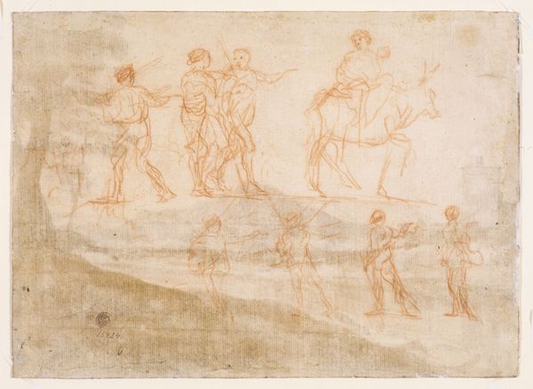 Editor: This is "Groups of Male Figures" by Vittore Carpaccio, created around 1514. It’s a pencil drawing. The red chalk gives the figures a warmth, but also a sense of incompleteness, like they’re waiting to be filled in. What jumps out at you when you look at it? Curator: Immediately, the arrangement of figures across the pictorial plane compels attention. Observe how Carpaccio employs grouping to create distinct visual clusters. Do you perceive the implications of their varying poses, the dynamic interplay of gazes, and the modulation in line weight that contributes to the perception of depth? Editor: Yes, the group on the left feels heavier, more grounded, because of the darker lines and how their backs are turned. The lighter group seems almost floating. Curator: Precisely. Now, let us analyze the distribution of light and shadow. Notice how the subtle gradations of shading sculpt the forms, delineating musculature and suggesting the fall of light across their surfaces. Consider, too, the compositional structure. How does the artist utilize the blank space to amplify the expressiveness of the figures? Editor: It almost feels like they are separate studies on one page. Are they supposed to be interacting? Curator: That is open to conjecture, certainly. Reflect, however, on the implications of these discrete groupings, on how the visual and intellectual rhythms between them are suggestive and incomplete, rather than definitively resolved. Editor: I see it differently now. I was so focused on the isolated feeling but looking at it formally makes me notice the contrasts and the way Carpaccio makes your eyes dance across the drawing. Curator: Indeed. Formal analysis allows us a unique mode of insight and appreciation, directing the observer towards intrinsic artistic merit and design principles.