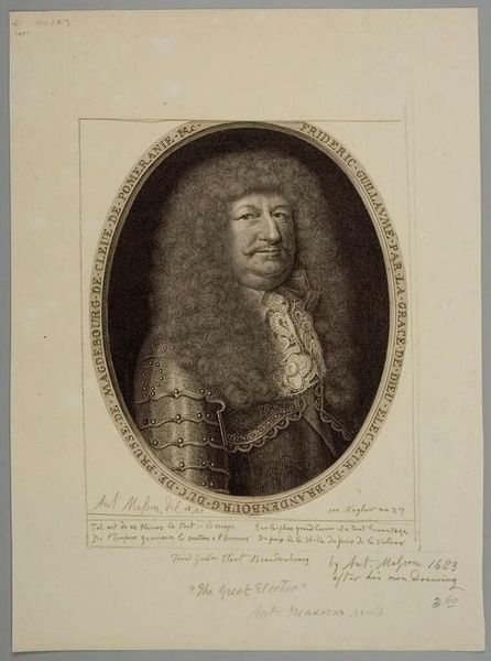 Curator: Editor: This engraving by Antoine Masson depicts Frédéric-Guillaume, a rather imposing figure. His wig is quite something! It seems like a statement of power. What strikes you about it? Curator: Ah, yes, the wig! It's like a stormy cloud framing his face. But look closer, notice how Masson used the fine lines to create texture. It's not just a wig; it’s a declaration, a theatrical costume for a man playing a crucial role on the European stage. What do you make of his armor? Editor: I see what you mean. The armor feels a bit antiquated but grand, like he's trying to evoke a bygone era. Curator: Exactly! He’s presenting himself as both a modern ruler and a figure rooted in history. It's a carefully constructed image, don't you think? Makes you wonder what he was really like behind all the pomp. Editor: Definitely gives me a lot to consider about image and power. Curator: It does for me too. Every time.