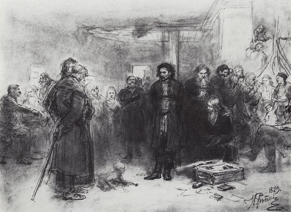 Curator: This drawing, "Les Interns - Sortie des geoles allemandes," made by Théophile Alexandre Steinlen in 1915 using graphite, charcoal, and print, portrays a somber group. I'm immediately struck by the textures he achieves with what seem to be simple materials. What draws you in? Editor: The crowd of people definitely creates a somber mood, almost bleak. And the style seems both realistic and a little exaggerated, capturing the harshness of the scene. How do you interpret this work, considering its materials and context? Curator: Well, consider the context. 1915, World War I raging. Steinlen, known for his social realism, likely made this print for wide distribution. Notice the starkness of the graphite and charcoal – readily available materials allowing for quick reproduction. It's not about opulent oil paints, but accessibility. This challenges our perception of "high art," wouldn't you say? How does that choice of inexpensive materials affect its reception, do you think? Editor: I see your point. The inexpensive materials almost amplify the message. It brings it down to earth and speaks directly to the people experiencing these hardships, or perhaps aimed to move those who weren’t. Curator: Exactly! Think of the labor involved in producing numerous prints – a collective effort to disseminate a message of human suffering. It connects directly to the working class, the primary consumers and subjects of his art. It bridges the gap between art object and social commentary. Editor: So, Steinlen used the medium itself, a readily available printmaking process, to directly engage with and comment on the societal realities of his time. The starkness complements the rawness of the depicted experience. It's about more than just representation; it’s about making art accessible and socially relevant. Curator: Precisely. Considering these aspects shifts the focus from mere aesthetic appreciation to an understanding of art as a product of its social and material conditions, as well as how consumption of that art by the masses impacts culture and thought. Editor: I never considered it in those terms before! Now I can appreciate Steinlen's choices as being about more than just visual representation but as conscious choices about production and distribution to influence the war effort at home.