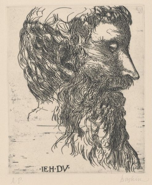 Adolfo Bellocq created "Hombre Bueno" using etching techniques. At first glance, one sees a stark, monochromatic study of a man's face, dominated by a dense, almost chaotic network of lines forming his hair and beard. This contrasts with the relatively smooth background, structured by a series of vertical lines, drawing immediate attention to the face's textured complexity. Bellocq masterfully employs line and texture not merely to depict a face but to convey a sense of depth and introspection. The dense etching creates shadows, suggesting a weight of experience or perhaps a brooding thoughtfulness. This manipulation of light and dark invites reflection on the nature of the human condition, questioning the balance between inner turmoil and outward presentation. The formal structure of the etching, particularly the contrast between controlled background lines and the expressive freedom of the facial features, serves to highlight the inherent duality within the subject, presenting the "good man" not as a simple, virtuous figure, but as a complex individual marked by the struggles of existence.