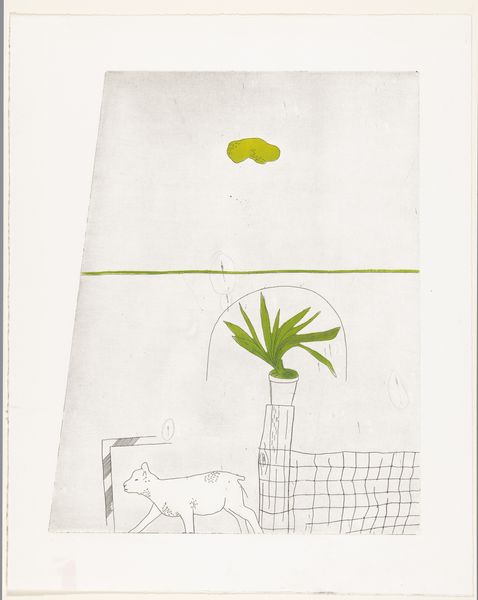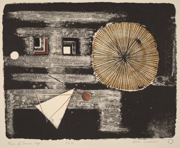 Editor: Right, so next up we have Conroy Maddox's "Scene of the Crime," from 1972. It's a mixed-media collage, incorporating acrylic paint and various other materials. I'm really struck by how unsettling such a domestic scene can feel – that eerie chair, those stains... what do you make of it? Curator: Ah, Maddox. Always a provocateur. For me, the crime isn't so literal, more an indictment of bourgeois comfort. That Eames chair, a design icon, is almost violated by the intrusion of those metal cylinders. Like thought processes become intrusions, too real in a space designed for appearances, a domestic scene becomes a theatre. It's really a collision of inside and outside, order and disorder. Does the curtain being partially drawn relate to being able to be exposed but still have some privacy? Editor: I never thought about the tension between comfort and something more sinister. The cylinders – you read them as thoughts? Curator: Perhaps? Or even repressed desires, rendered in cold, hard metal, unable to fit into that picture-perfect chair. Consider the “landscape” coming from the outside with some grass. All staged on a painted set of wooden floors. Editor: That's a great point. So, he's using recognizable imagery, a familiar space even, to hint at something hidden beneath the surface, and something that goes back and forth between what is intimate to oneself versus the facade? Curator: Precisely! The 'scene' itself becomes secondary to the psychological drama unfolding within it. Madness, really, becomes present by exposing “scene” as an intersection of mental landscapes. Editor: Well, I will never look at an Eames chair the same way. Thank you! Curator: My pleasure, hopefully I helped highlight some thoughts from madness itself, who knows what the artist wants but that is part of what is fascinating in how we, the spectator, change ourselves after a “view”.