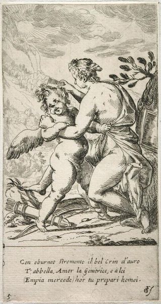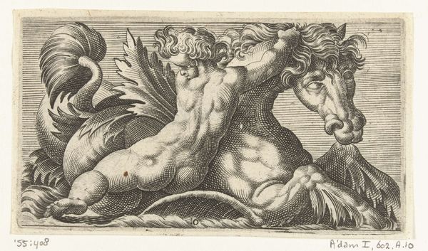 Curator: This is an engraving entitled "Kind met een saterhoofd bij een zeebok," which translates to "Child with a Satyr's Head by a Sea Buck." Editor: Immediately striking—the stark contrast of the crisp lines creates an intense yet unsettling dynamic. The grotesque satyr and chubby child evoke a disquieting feeling. Curator: It's a baroque piece, a print estimated to be from around 1526 to 1606, attributed to Adam Fuchs, and currently housed here at the Rijksmuseum. Let's delve into the materiality of its creation: the process of engraving on a metal plate allowed for mass production of these images, democratizing access to mythological themes and allegorical content, once confined to elite patronage. How does this reproductive capability influence its impact, do you think? Editor: The engraving technique yields to strong visual textures which enhances the sculptural forms—the hair of the child, the muscularity of the sea buck. The dense hatching is remarkable, and builds drama and creates almost tangible forms. But what is the story being presented? Is this simply about form? Curator: The allegorical subject presents the theme of human mastery over nature, a child confidently grappling with the mythical creature—it subtly reveals a relationship between humans and the natural world. I suggest, however, the intended consumption also shapes the content, perhaps satisfying a niche erotic appetite. How does this interplay between content and distribution change the object's role? Editor: I'd say that even stripping away all external context, we are still left with interesting contrasts: innocence vs. grotesque, smooth skin vs. furry beast. The composition forces us to look. It's the deliberate use of visual vocabulary that keeps our attention—materials allow narrative, I see that—but not the whole story. Curator: A convergence, perhaps? The engraving technique democratized both artistic dissemination and content; it facilitated artistic and perhaps erotic narratives for an emerging audience while displaying skilled artistic labor. Editor: So, between lines of metal and thematic undercurrents, it’s a meeting point of intention and result. Quite the synthesis.