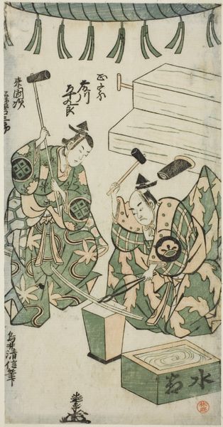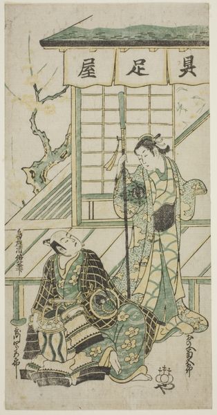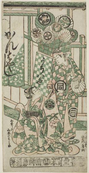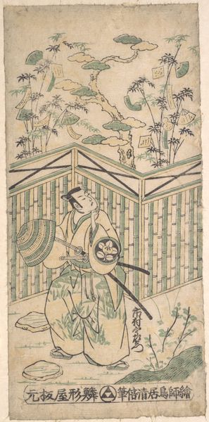 Curator: First impression? That fellow's certainly caught in a reverie, eyes gazing toward some unseen marvel! Editor: He is, isn't he? There's a touch of melancholic yearning to it, as if he's searching for something just out of reach. Well, this is a woodblock print from 1747, titled "The Actor Ichimura Uzaemon VIII as Oguri Hangan in the play 'Mangetsu Oguri Yakata,'" by Torii Kiyomasu II. Curator: The title gives a bit away. A performer, not necessarily himself at all but embodying a role... and note the fence and the bamboo with those paper ornaments. They suggest a festive atmosphere tempered by that wistful expression. Editor: Ukiyo-e! The fleeting world! I find the delicate, almost pastel palette adds to that feeling. Everything feels transient, a whisper of a moment. It's funny, the theatrical nature of this period allows the art to carry many identities at once. Curator: Yes, consider the symbolic weight of theatrical portraiture during the Edo period. Actors were cultural icons, figures of aspiration, vehicles through which anxieties, desires, and societal critiques were expressed. Editor: The fan's design and his formal garment are very beautiful. That simple flower seems full of significance... Do you know what role Oguri Hangan was known for? Curator: Oguri Hangan is a celebrated folk hero whose life unfolds through tragedy, triumph, and, ultimately, spiritual redemption. He is poisoned, left for dead, and miraculously revived. Editor: Aha! And the actor portraying him is, in that very moment, embodying both a known figure and an imagined other... the role allows them to play many roles at once. Even now! It is beautiful that he almost transcends that fence; the eye is guided to the bamboo over the barrier that may limit him from moving past it, and the props hung to its stems look like notes, or little messages of freedom. Curator: Consider then, the resonance. It transcends literal performance. Ichimura, as Oguri, mirrors a shared cultural yearning. What appears to be individual is actually shared and reflected through this very conscious performance. It’s endlessly rich! Editor: A wonderful thought, thank you! A single still image that hints at so much flux... both personally and within the art's ongoing relevance!