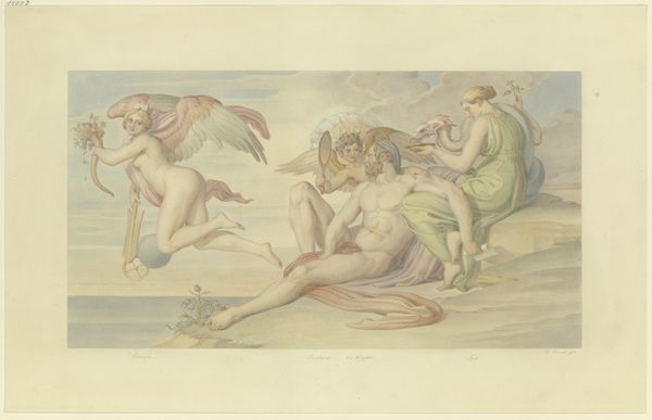 Curator: At first glance, it's a swirling scene, full of pastel shades, movement, and mythological figures rising out of what appears to be a sculptural base. Editor: Indeed. What we’re looking at is "Ontwerp voor een behangselschildering met Coronis en Minerva," or "Design for a wallpaper painting with Coronis and Minerva" by Rienk Keyert, created around 1751. It's currently housed at the Rijksmuseum. It is executed in watercolor. Curator: The watery application suits the subject. Observe how Keyert orchestrates a hierarchy of figures. Minerva, armored and with a shield, presides over Neptune who gestures urgently below, the scene underpinned by that architectural, trompe-l'oeil element. Editor: The materiality speaks of a society embracing refinement and luxury. Watercolor lends itself to delicate execution but consider the economic context: commissioning decorative pieces like this signaled wealth and status, and reflected specialized artisanal labor and the trade of pigments and paper. Curator: Consider the interplay of gesture and gaze. Neptune’s supplication, Minerva's impassive countenance; it all reads as high drama. Keyert employs a classical vocabulary, drawing heavily from Baroque aesthetics to enhance the scene's emotive force. It’s an allegory, presented for perhaps a formal dining room. Editor: Allegory was a language understood by the elites. But to focus on the materiality further, the pigment itself holds stories, revealing trade routes, the accessibility of materials, and labor practices of the time. Watercolors demanded meticulous technique. We need to acknowledge the unseen hands that contributed to this visual spectacle. Curator: Your emphasis reframes our reading of the work, certainly. This artwork's significance lies also in how it reflects the intellectual climate of the time. The renewed interest in classical themes offered fertile ground for these designs. It's about a balance between form, allegory, and the hand of the artist shaping these grand narratives. Editor: Ultimately, examining its genesis provides a more grounded appreciation for both the aesthetic intention and its wider cultural implications.