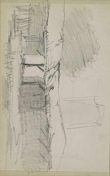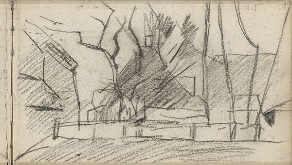 Curator: This graphite drawing is titled "Straatgezicht met figuren," or "Street View with Figures" and was created sometime between 1875 and 1934 by Isaac Israels. Editor: It feels more like a memory than a street view; hazy, unfinished... evocative. Curator: Indeed. Israels was deeply engaged with representing modern life, and the immediacy of the sketch really captures that, doesn't it? Look at the hurried lines. I think this reflects the urban experience during the industrial revolution, capturing the ephemeral moments. It reminds me of Walter Benjamin’s writings on the flâneur and their detached observations within an ever-changing urban landscape. How do you perceive that hurried technique here? Editor: It certainly lends to that feeling. But beyond the subject, to me it's how these rough, vertical strokes might represent an aspiration, as though searching, perhaps unfulfilled dreams... especially considering it is incomplete. I keep returning to these ladder-like shapes here on the lower left. Curator: Ladders leading nowhere, perhaps suggesting limited upward mobility for certain classes in the period? And the blurred figures…they blend with the buildings almost, like shadows. This speaks to issues of anonymity and social alienation in urban settings, even class divisions that affected visibility within the societal landscape. The use of graphite almost makes it look as if it could be wiped away or that society would just move beyond that time. Editor: Right, as though this space of striving may, in itself, fade away, the aspiration ultimately forgotten... which gives it a poignant edge for me. We're left with an impression of a very temporary, shifting space, like a dream we once had. It has an eerie, haunting atmosphere. Curator: Well, I think what's striking is how such a quick, seemingly informal drawing can raise so many profound questions about identity, class, and representation within a rapidly changing world. Editor: Yes. And it is fascinating how his personal quest mirrors these broader questions of how we look at our own internal images when our experiences affect those impressions. It's interesting how his image seems incomplete, a dream left behind for time.