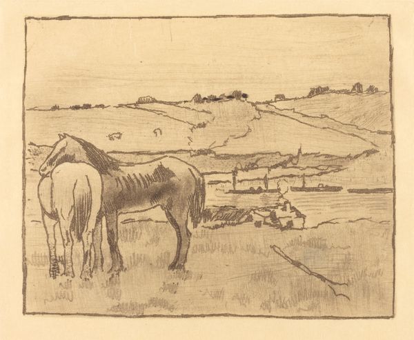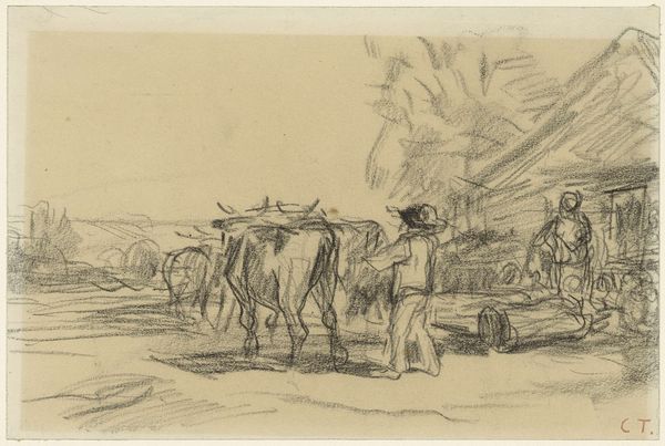 Editor: Here we have "Team of three horses pulling a wagon on a sloping field in Limburg," a pencil drawing made by Pieter de Josselin de Jong between 1871 and 1906. It has a rough, immediate feel that I really like. How would you interpret this work? Curator: What I see here is the weight of tradition and the enduring link between humanity and the land. Horses pulling a wagon is not simply a mode of transportation; it evokes centuries of agrarian life. It is an image carrying an almost archetypal significance – the cycle of labor, the turning of the seasons, the rural. Editor: I hadn't thought about it as evoking history, I was so focused on the sort of everyday aspect of it, but you're right. Are there any symbols that you see here that hint at these deeper ideas? Curator: Consider the position of the human figure, seemingly guiding the horses, almost subservient to their strength, it recalls our reliance on nature's power. This drawing resonates as an homage to a simpler way of life that was gradually fading during the Industrial Revolution, a poignant reminder of a cultural identity rooted in the earth. What emotions does this contrast evoke within you? Editor: I guess there's a subtle melancholy to it. It is like a visual record and a goodbye at the same time. It feels more significant now than it did before. Thanks! Curator: Precisely. Art, after all, preserves more than just images; it enshrines feeling, memory, and a cultural continuity which is critical to understand humanity's trajectory. A simple pencil drawing is a powerful mnemonic device!