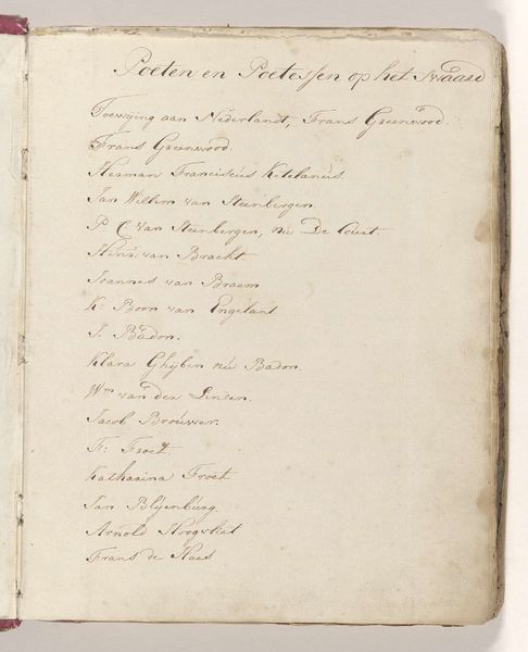 Editor: Here we have "Naamlijst van dichters," or "List of Poets," an anonymous drawing from around 1743-1745. It's ink and watercolors on paper. It looks almost like a notebook page, simple but the handwriting has a certain charm. What do you make of it? Curator: This isn't just handwriting; it's an example of labour, and it challenges our assumptions of 'high art.' Ink and watercolour drawings on paper. The paper itself – was it mass produced, handmade? Who produced it, under what conditions? Think about the act of writing itself, especially before mass literacy. It was a skilled practice, tied to specific trades and access to knowledge. Who were these poets and how are their names associated with commerce, guilds, family lineages? Editor: So, you’re less interested in the poetry itself and more in…the physical act of writing and the making of the object? Curator: Precisely. Look at the apparent simplicity. But this simplicity is deceptive. Who chose to write these names? For what purpose? To what extent could it have served to represent some form of labour, or to display knowledge to a select circle or a means for social distinction through the careful acquisition of knowledge through calligraphy and materials. Editor: It’s true, I hadn’t considered the social implications of just the writing itself. Almost like a demonstration of skill, or, like you said, access. Curator: Exactly. We're looking at a document rooted in specific material practices and social dynamics. Think of the quill, the ink, the labour involved. Editor: That gives me a lot to think about! I never really considered how much could be gleaned from the materials themselves. Thanks!