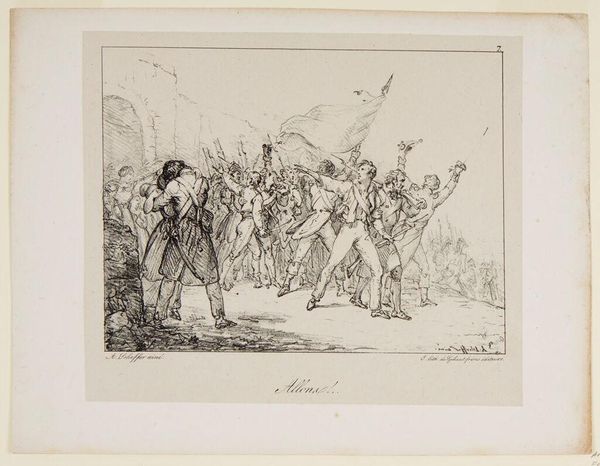 Curator: This is Nicolas Toussaint Charlet's "Column of Infantry on the March," created between 1817 and 1818. It’s a print, roughly 25 by 36 centimeters, from the Harvard Art Museums collection. Editor: My first impression is one of somber determination. The stark monochrome emphasizes the weight of their duty, both physically with their gear and emotionally in their downcast faces. Curator: Charlet, deeply affected by the Napoleonic Wars, often depicted soldiers—not as glorious heroes, but as men burdened by conflict. This work reflects the shift in public sentiment post-Napoleonic era. Editor: Exactly. We see a clear depiction of the human cost of war, absent of romanticism. There’s an emphasis on the collective, too, which is critical, portraying shared identity, but it's all about shared burden. Curator: It invites us to consider the sociopolitical impact of militarism and the individual stories woven into the fabric of larger historical events. Editor: Yes, and for me, it is a poignant reminder of the experiences of ordinary people caught in the machinations of power.