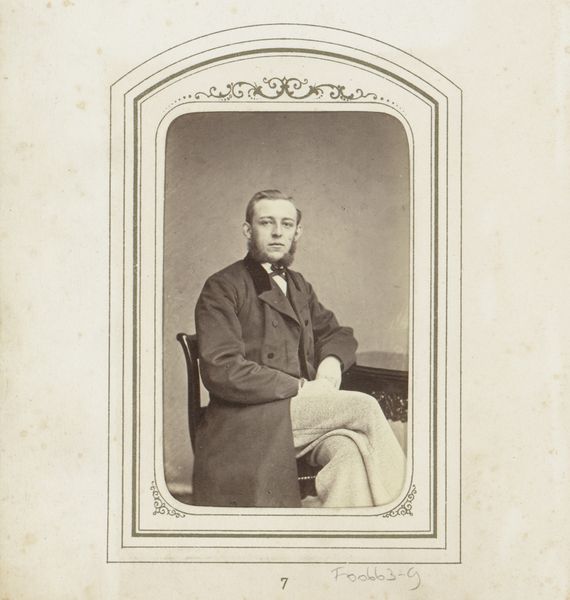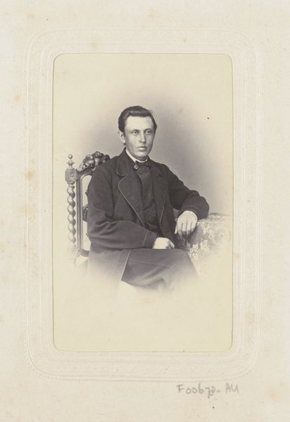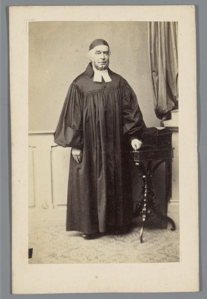 This is a photograph of H. Laatsman made by Ch. Binger & Co. In this portrait, the subject's formal attire immediately catches the eye, contrasting with the soft, almost muted sepia tones. The composition is structured with a clear emphasis on Laatsman's figure, seated and centrally framed. The lines of his robe and the stark white collar draw attention to his face, creating a focal point that invites scrutiny. Consider how the use of light and shadow, though subtle, defines the contours of his face and clothing, adding depth to the image. The choice of a subdued palette contributes to a sense of solemnity. This is not merely a recording of an individual but a constructed image that adheres to certain codes of representation. What does it mean to present oneself in such a manner? The photograph serves not just as a personal memento but as a statement about identity, profession, and perhaps even societal values. The formal qualities of the photograph invite us to reflect on the relationship between appearance and reality, and the ways in which photography can both capture and construct meaning.