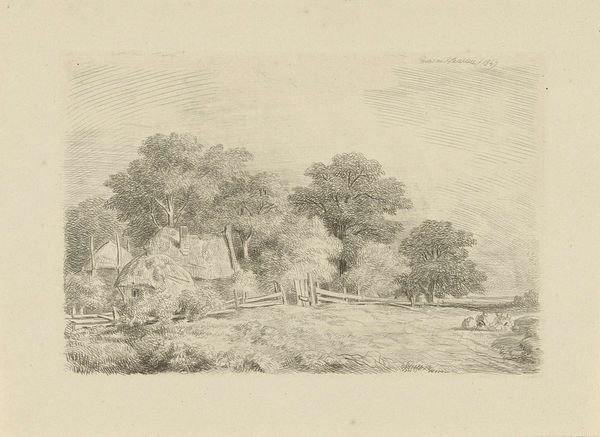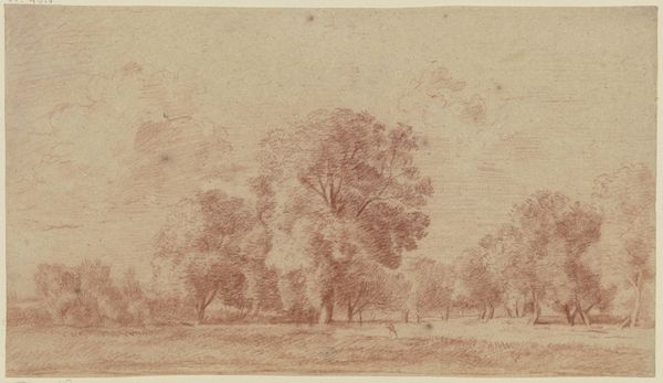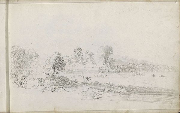 Editor: This lovely, small pencil drawing of a landscape, by an unknown artist from the British School, feels so fleeting and dreamlike. The trees seem to whisper. What do you see in it? Curator: It's like a half-remembered summer day, isn't it? I imagine the artist quickly sketching this en plein air. There's a lovely lightness of touch, a sense of capturing a fleeting moment. Do you think the vagueness adds to its charm? Editor: Absolutely! It's less about the specifics of the place and more about the feeling of being there. Something about the quiet observation makes me nostalgic for something I haven't even experienced. Curator: Precisely! It reminds me of those half-formed thoughts that drift by when you're lost in nature. A peaceful little window into the past. Editor: I agree. I'll definitely be pondering the feeling of this piece.
