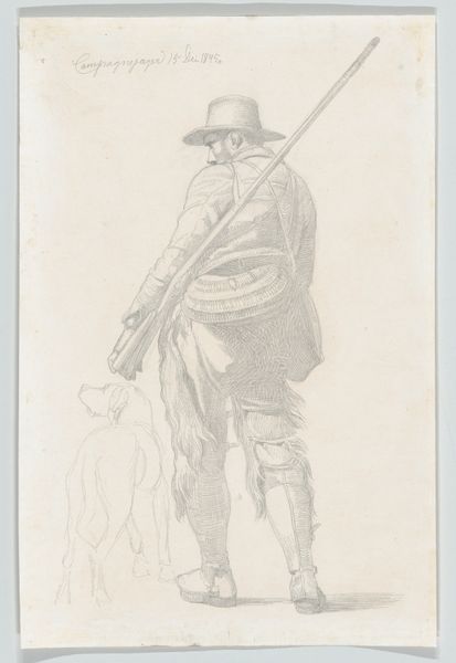 Georg Melchior Kraus created this drawing of a standing man with a halberd and saber in the 18th century using watercolor and graphite. Kraus was director of the Weimar Princely Free Drawing School, an institution which promoted the aesthetic of the Enlightenment. This image reflects the rigid social hierarchies of the time. The man's upright posture and weaponry denote authority, while the artist's chosen medium of watercolor may reflect the sitter's status and the social function of the work. Kraus was known for his commitment to Neoclassicism, seen here in the emphasis on line and form, and a certain emotional restraint. Consider how the subject's stance and expression communicate not just individual identity but also the values of order, reason, and control that were prized during the Enlightenment. The drawing offers a glimpse into the visual culture of 18th-century Germany, inviting us to reflect on the power dynamics embedded within seemingly simple representations of identity.