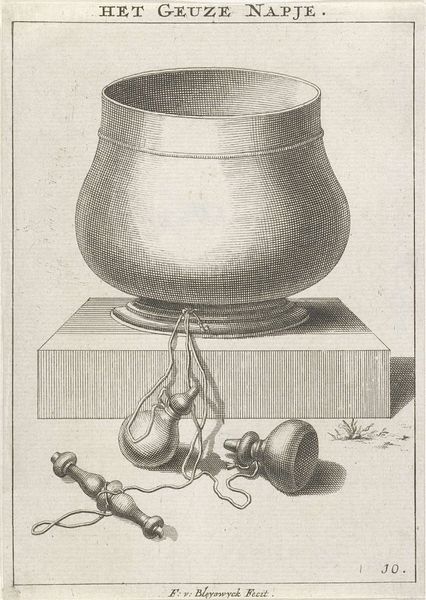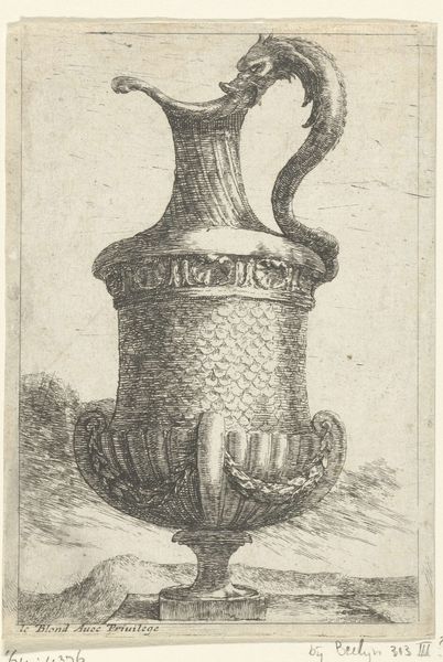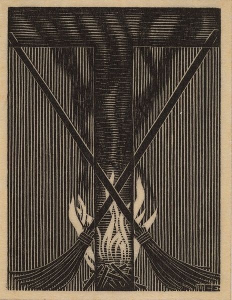 Editor: Today we're looking at M.C. Escher's "Initial D," a print from around 1932. The strong lines create a very graphic, almost architectural feel. I am interested by the D form framing the subject. What’s your take on this piece? Curator: Well, for me, "Initial D" isn't just about a letter, it is a whole universe captured in stark black and white. It reminds me of a secret code, a personal signature transformed into a public artwork. See how the lines vibrate, creating a sense of depth, almost tricking the eye? It's Escher playing with perspective long before his mind-bending tessellations. Editor: I see what you mean. It's definitely more dynamic than a simple initial. Is that a pot of tea depicted inside the "D"? Curator: It certainly appears to be! And notice the steam curling upwards? Those organic wisps are a beautiful contrast to the rigid, geometric "D". It is like Escher saying, "Even within structure, there is room for the spontaneous, the emotional, the very human". Do you think there is some irony that Initial D also might resemble digital data? Editor: Oh, that’s a very modern take on it. Curator: In those parallel lines, there is much that you see if you think about our obsession with control over what we think and do! I find the print eerily compelling. Almost frightening! What would you say, is the object trapped by that "D", or liberated by it? Editor: Hmm, I hadn't considered that. Maybe it’s a bit of both, a defined identity and a feeling of being trapped. Thanks; you have given me much to ponder. Curator: The best art always does, doesn’t it?
