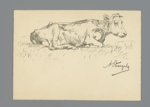 Curator: Alphonse Stengelin's pencil drawing, "Liggende koe", placing the artwork in the period of 1876 to 1910, presents a realistic landscape with a recumbent cow as its central subject. Editor: There's a kind of melancholy stillness about this. The limited tones almost evoke a photograph bleached by the sun. It feels unassuming, deliberately lacking in drama. Curator: I see a different symbolism emerging. Cows, throughout art history, often embody concepts of peace, contentment, and pastoral abundance. Here, the cow’s relaxed pose evokes a connection to the land, a primal unity between animal and nature. What's more, in certain agrarian cultures, cows are deeply interwoven with prosperity and are regarded as highly precious assets. Editor: The drawing itself, pencil on paper, makes me think about access and economy. Was this pastoral scene meant for display, or was it a sketch, a study? What would the presence of a single cow mean to the labor of farm life and local industry? Curator: Those are vital questions regarding production. Notice how Stengelin carefully renders the animal, capturing its form and texture with remarkable detail, even within the simplicity of the drawing's execution. Doesn't this act alone show respect, possibly veneration, toward its subject? Editor: It’s precise, yes, yet what intrigues me is how seemingly simple the artistic gesture itself is. This pencil line and tonal range emphasize that even minimal tools can portray how profoundly entwined animal labor and farm life can be. What did it signify at the time? And, even further, for those looking at the scene right now? Curator: Maybe that simple life endures—a vision of contentment, the slow rhythms of nature persisting amidst an ever-changing world. It acts as a counterweight against all disruption and complexity. Editor: Yes. A reminder that the means shape what, and how, we perceive. The humbleness of pencil and paper gives strength to Stengelin’s scene, making it incredibly resonant and profoundly tangible.