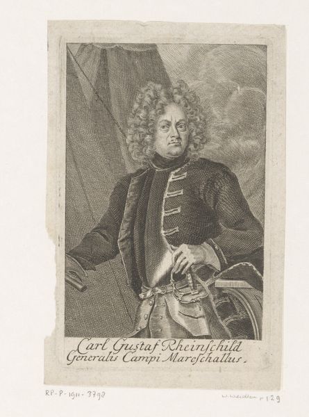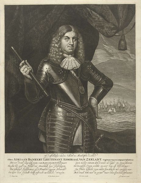 Andries van Buysen the Elder created this portrait of Christoffel Myddaghten using etching and engraving techniques. The setting for this portrait is not a domestic space but a naval battle, against the backdrop of a turbulent sea. The portrait offers insight into the values and social structures of the time. Myddaghten's identity is constructed through symbols of power, like his stance before the chaotic naval battle, his baton, and the cannon. He’s cool, calm, and collected. These elements speak to the importance of military prowess in shaping one’s identity and social standing. There's an emotional tension between the chaos of the sea and Myddaghten's composed demeanor, between the backdrop and the foreground. What does it mean to be in control during times of war? In what ways are one’s emotions connected to the shifting tides of society? This artwork, therefore, captures the personal qualities admired in leaders, while subtly hinting at the emotional cost of power.