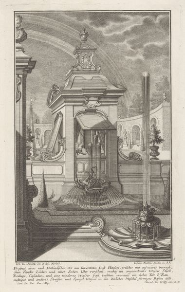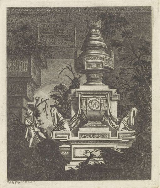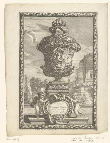Jean Laurent Legeay created this intricate print, "Landschap met groteske vaas," using etching techniques. The eye is immediately drawn to the elaborate vase, its ornamentation dense with classical motifs that suggest a dialogue between nature and artifice. Legeay uses line and form to establish a complex composition. Trees act as framing devices, their branches arching inwards to spotlight the vase. The vase, positioned slightly off-center, is not merely an object; it is a constructed spectacle, a focal point around which the landscape seems to arrange itself. The grotesque elements, such as the monstrous figures adorning the vase's base, destabilize traditional notions of beauty, prompting questions about the relationship between the sublime and the bizarre. Note the tension between the organic, freely sketched foliage and the rigid, architectural qualities of the vase's pedestal. This interplay invites us to consider how eighteenth-century aesthetics grappled with the boundaries between the natural and the artificial, and how artists like Legeay negotiated these ideas through form and representation.