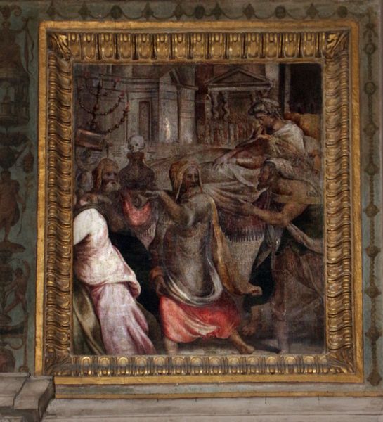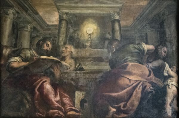 Curator: Palma il Giovane's "David Receives from the Priest Ahimelech the Unleavened Bread from the Sanctuary," created in 1593, is a narrative painting that captures a poignant moment of refuge and survival. Editor: The whole scene is dipped in earthy tones, but there's this striking red robe that David's wearing, as if to suggest something's about to spill... blood, perhaps? I immediately feel like something is not quite right with the composition. It’s intriguing, yet also a tad unsettling. Curator: It absolutely should feel that way! Consider the historical context: David, fleeing from Saul, seeks help from Ahimelech, the priest of Nob. The act of receiving the sacred bread, normally reserved for priests, highlights themes of desperation, divine exception, and the blurring of secular and sacred boundaries. We can read David’s flight as a critique against unjust power. Editor: It's as if the painting hints at something being amiss within the power structures of its own time, not just depicting ancient strife, but also mirroring 16th-century societal conflicts through color and symbolism. Do you feel the light and shadow is dramatic, or sort of heavy handed? Curator: I see what you mean by “heavy-handedness”, however, think about it as creating both drama and, allegorically, darkness encroaching on David’s world, yes, but equally important in emphasizing the tension between David’s actions of desperation and the sacred nature of the sanctuary and its objects. The darks and lights become then, if you like, “players” in a game of shadows cast by those actions. Editor: Mmm, yes I see it now; perhaps less clumsy, more allegorical, really mirroring that tense relationship you’re highlighting between divine law and the mortal realm, so I should rephrase, less 'heavy handed', more purposeful use of the colour scheme, I feel. Looking closely at David, he embodies conflict—a mixture of defiance and utter humility. And if that's true in David himself, then he in a way personifies that boundary we've been speaking about. It's quite complex, isn't it? Curator: And there's where, I feel, its lasting impact resides – in how it compels us to question the systems and actions we take for granted, it's really interesting isn’t it? Editor: I hadn't really focused on narrative painting until this discussion, it always felt somewhat predictable and uninspired for me but it seems, after some decoding, a new dimension opens up! It is much more challenging than what appears on the surface. Thank you!