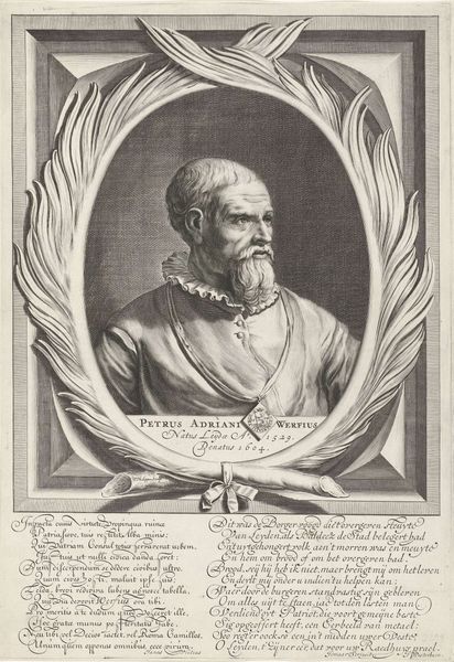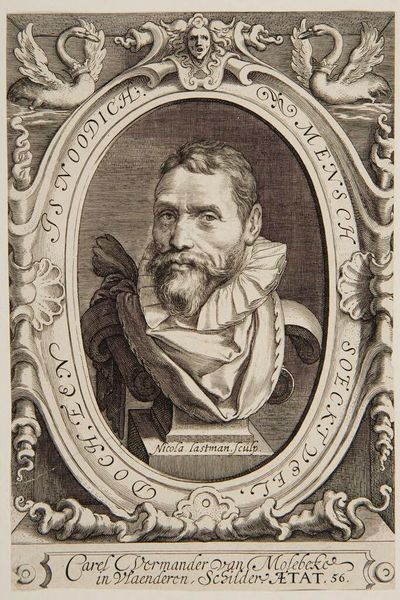 Editor: So, this is Nicolaes Lastman’s “Portrait of Karel van Mander,” an engraving from 1604. It's really detailed, but there is a sort of haunting feeling. It's surrounded by such intricate imagery; I wonder what it all means. What catches your eye in this print? Curator: Indeed, it is the web of symbols that speaks volumes. Swans are creatures of light and grace, representing purity and transformation, perhaps nodding to van Mander's artistic talent and refined nature. Do you see the ambiguous figurehead crowning the portrait? Editor: You mean at the very top? Yes, its face is somewhat ambiguous. Curator: Note how it resembles Janus, the two-faced Roman god, marking transitions and duality. It may symbolize van Mander's roles as both artist and writer, looking back at the past and forward to the future. Consider the text framing the portrait—each letter, carefully etched, contributes to the overall meaning. It speaks of deep consideration. Editor: It’s beautiful calligraphy; almost too beautiful to be incidental, and the frame with floral decorations is rather ornate as well. The artist must be hinting at the impact van Mander has on his craft. Curator: Precisely! The inscription, combined with the surrounding ornamentation, emphasizes van Mander's erudition and contributions. Lastman isn't simply depicting a likeness; he's crafting a visual monument, steeped in symbolism, honoring van Mander's legacy for future generations. Editor: I never would have seen that much looking at just a portrait. Thanks! Curator: These early modern prints offer layered meanings beyond the immediately visible. Now we may approach it as a historical artefact!