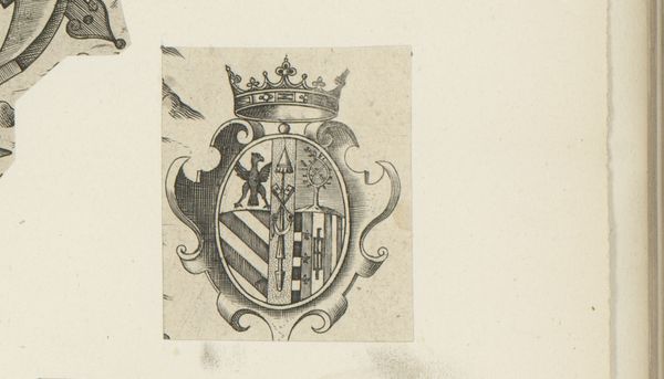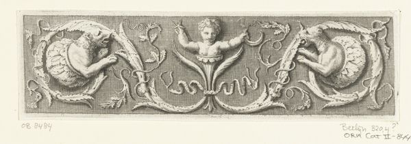 Editor: Here we have “Halve ronde cartouche met schaalstok,” or “Semicircular Cartouche with Scale Bar,” made around 1595 by an anonymous artist, created using pen and ink. There’s an interesting contrast between the strict geometric forms and the decorative embellishments. What jumps out to you when you examine this piece? Curator: It is the articulation of line and form which captivates. The starkness of the pen strokes define a rigorous composition. Note the careful deployment of hatched lines to create tonal variation; the stippled background in stark contrast to the clean lines of the cartouche itself. Observe also the rhythmic arrangement of circular forms juxtaposed with the angularity of the scale bar below. This visual play contributes to the dynamism. Editor: So you're focusing more on the arrangement and use of line itself rather than… what it’s meant to depict? Curator: Precisely. Meaning, within the image itself, is subservient to the form. We must consider the relationship between its constituent elements and how they collectively engage the viewer's eye. The meticulousness of execution invites a formal consideration, wouldn’t you agree? Editor: Yes, I see that. It almost feels like an exercise in pure form. Is it possible to remove the element of artistry by stripping all external meanings? Curator: Perhaps. But art, like language, inherently conveys something, whether intentional or not. The beauty here is precisely how the bare essentials of pen and ink yield such compositional sophistication, no? It speaks to the power of visual architecture. Editor: I am seeing more the deliberate composition now. Thanks for elucidating the interplay of lines and shapes!