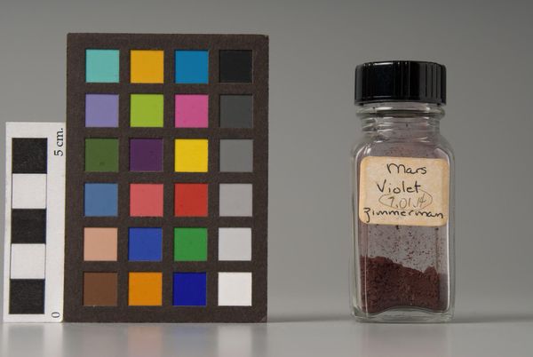 Editor: Here we see Van Dyck Brown, manufactured by Winsor & Newton. It's a jar of pigment next to a color calibration chart. I’m struck by the implied relationship between industrial production and artistic creation. What does this pairing suggest to you? Curator: It highlights the commercialization of art. Winsor & Newton and similar companies have long influenced artistic practices by controlling the availability and promotion of specific colors. How does this impact the artist's agency? Editor: So the artist's choice of materials is, in a way, shaped by market forces? That's something to consider. Curator: Exactly. We often overlook these influences when admiring a finished painting, but understanding them can illuminate the context in which art is made and received.