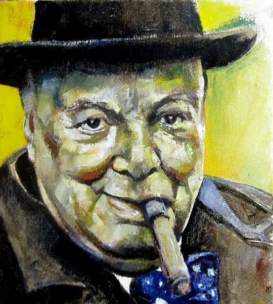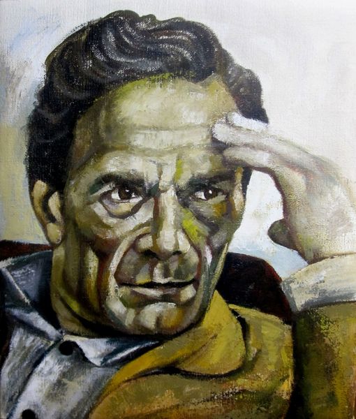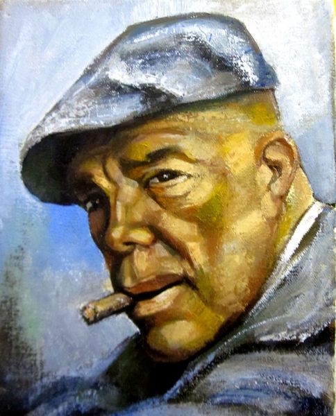 Curator: I find the visible brushstrokes on this oil painting quite compelling. Editor: Yes, there's something immediately striking about the materiality, isn’t there? This piece, titled "Portrait of Humphrey Bogart," created in 2018 by Zani Corrado, presents the iconic actor with a modern, almost raw, edge. It makes you consider Bogart's enduring influence on our cultural memory. Curator: Absolutely. The artist’s application of paint creates a texture that almost mimics the grit and world-weariness so often associated with Bogart’s characters. Look how the face is built up with distinct blocks of color, juxtaposing dark shadows against bright highlights. Editor: You can't deny how this work plays with the actor's on-screen persona, but I also consider it as a comment on the romanticized masculinity of the mid-20th century, don’t you think? Bogart became a symbol of cool defiance during an era of social upheaval. Curator: Interesting! The composition directs our focus entirely on the actor's face, specifically his eyes. The cigarette is also prominent, but in the cultural and political context, the focus is definitely on his look, the "cool defiance" that you said. Editor: The asymmetry actually holds the whole thing together. And color palette--the earthy tones mixed with those surprising blues in his jacket--that suggests a complexity beyond a simple surface. Curator: Do you believe the artist successfully captures the essence of Humphrey Bogart? I can recognize it’s him, but maybe the image plays more on our collective idea about who he was. Editor: I find the very choice to paint a figure so ingrained in cinematic history a telling act of cultural engagement. It raises questions about the nature of fame and representation today. But let me come back to the technical mastery...it is what allows the social critique to even begin. Curator: That makes sense to me. Looking closely reveals even more of how its technique amplifies the broader meanings and lasting image that Bogart left us. Editor: I agree wholeheartedly! A superb exercise in both formal painting technique and astute cultural reflection.