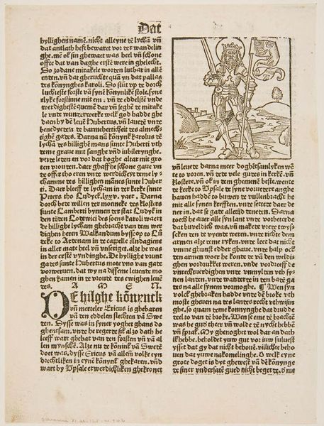 Curator: Here we see an interesting example of early printing, an anonymous work titled "Saint Mark the Evangelist." What strikes you first about this piece? Editor: The raw quality of the woodcut really grabs me. The scene is stark, almost brutal. There’s a sense of immediate action—or perhaps interrupted action. Curator: Indeed. The materiality emphasizes the labor, both physical and intellectual. The block had to be carved, then printed, suggesting a wider reach than a single illuminated manuscript could achieve. Editor: But what is the symbolic language at play? Saint Mark is often represented with a lion, and I see something like a lion skin at his feet, but there is no traditional halo. And above, behind a stone wall, are onlookers. This feels almost theatrical, like a passion play. Curator: Perhaps these symbols would resonate more deeply within the context of the time. Editor: Absolutely. And that's why diving into the iconography can unlock so much richness. It transforms our understanding of both the image and the culture that produced it.