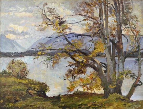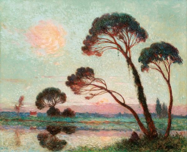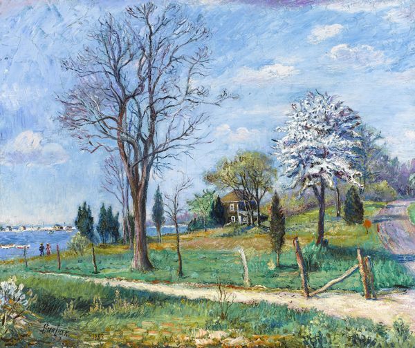 Curator: Looking at “Blühende Mandel,” or “Blossoming Almond,” by Willy Schlobach from 1912, painted in oils, what strikes you? Editor: The way the brushstrokes build up, creating a tangible surface texture—it makes me want to touch it, feel the density of the paint itself. There's also a clear effort to capture the transient light. Curator: The choice of the almond tree is rich in symbolic meaning. Almond trees are among the first to bloom in the spring, signifying awakening, hope, and the ephemeral beauty of nature. Schlobach may have intended this painting to evoke these associations, linking it to broader cycles of life. Editor: That's interesting, I was primarily observing the raw materiality—how the oil paint is used to create the image. The facture, impasto, and brushwork all feel essential. Do you think it's fair to frame this as a post-impressionist exploration of landscape, or are we imposing too much meaning onto it? Curator: Well, Post-Impressionism certainly pushed the boundaries of representation. Looking closer at the artwork, one can see how it blends Impressionistic techniques with more expressionistic colors, the artist isn't trying to replicate reality. Instead, it's as if Schlobach is expressing the subjective feeling evoked by the blossoming tree, making the symbolism all the more personal. Editor: And looking at the larger social picture: materials, transportation, the economic structures involved...all so crucial to understand the work’s existence. I do find it intriguing that what feels like quite humble, grounded imagery opens up symbolic interpretations. Curator: Precisely! The almond blossom as a harbinger of renewal allows us to see beyond the purely representational, pointing to deeper cultural narratives embedded within the seemingly simple image. Editor: After delving into its making, I do find that this piece moves beyond just the visual; it's become an emblem of the hopes invested in natural cycles and artisanal production, that would’ve held significance in the early twentieth century, for both maker and beholder.