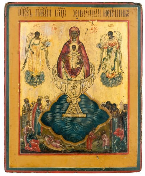 Curator: Here we have an intriguing Orthodox icon titled "Our Lady of the Burning Bush," created around 1850. The artist, unfortunately, remains unknown. It’s a tempera painting, typical of Byzantine art traditions. Editor: Well, right off the bat, it feels… intense. Almost feverish. The double star shape really grabs you. It's as if I'm looking through some kaleidoscopic vision. Not sure what to make of it. Curator: It's meant to be a theophany, a visual representation of divine revelation, Editor. The Burning Bush is a reference to the Old Testament story where Moses encounters God in a flame that doesn’t consume the bush. Visually, the two overlapping stars symbolize the divine fire and the Virgin Mary herself. Editor: Ah, the double star... Now I see it. So, it’s this symbol combining earthly matter and divine presence. It is powerful. I'm drawn to the smaller scenes surrounding the central image of Mary and the Christ Child. Who are those figures? What are their stories? Curator: They represent prophets and scenes related to the Virgin, almost a miniature narrative of salvation history. It’s characteristic of icons to layer these symbolic figures. In terms of art and social function, Orthodox icons such as this one, weren’t mere devotional objects, they affirmed collective belief and were integral to a lived religious experience within the community. Editor: I see. So, in the social imaginary of mid-19th century, this artwork plays the critical role in consolidating the local religious community, visually confirming beliefs, reinforcing shared values and collective cultural identity. Still, something about that bold combination of reds, greens, and golds… the overall design pushes it beyond pure functionality. It’s like it’s also trying to ignite a mystical feeling in the observer. Curator: Exactly. Icons aren't just illustrations of stories; they are windows into the divine. Look at how the artist utilizes line and color—everything points inward, toward that central image. And although somewhat damaged over time, there’s an unmissable feeling of awe within this image. Editor: I agree. It’s a complicated image that successfully merges a historical religious narrative and some intense devotional feeling. And considering it was made at such a pivotal period in Russian history, you can't help but wonder how an image like this one resonated in everyday life.