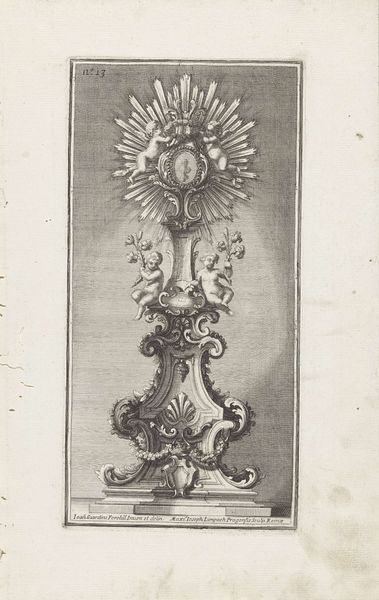 Editor: So this engraving from 1714, called "Reliekhouder met putti en een bediende met een dienblad," by Maximilian Joseph Limpach, it's fascinating. All these little putti and ornate details...it feels so over-the-top! What really strikes me is how this object is meant to be consumed. What can you tell me about this work? Curator: Considering Limpach's era, let's consider the production and consumption this object implies. Engravings like this one weren't just about aesthetic pleasure; they were a commodity. Who would commission and buy such an image, and what was their aim? Was it for architectural inspiration or perhaps religious display? What specific materials— the paper, the ink— were accessible and utilized in 18th-century printmaking, and how did that affect distribution and, consequently, the social circulation of imagery? Editor: That’s a good point. I hadn't thought about it in terms of being a commodity itself. It’s interesting how something seemingly focused on luxury is spread through mass production of sorts. It makes you wonder how affordable such an engraving was and whether it brought Baroque extravagance to wider audiences than those who could afford the 'real thing.' How accessible was the process of making such engravings? Curator: Exactly! Engraving, unlike painting or sculpture, allowed for replication, opening doors, however narrowly, to those lower down the socio-economic rungs. Who possessed the skills, tools, and access to reproduce Limpach's imagery, and to what extent was this craftsmanship monopolized by elite guilds? What does this tell us about artistic labour at the time? Editor: This makes me look at the image in a totally different light. It's not just about cherubs and ornamentation; it’s also about materials, accessibility, and how this form of art played its role in early mass culture. Curator: Precisely! This reveals that Baroque extravagance wasn't exclusively for the high-born but, due to the specific medium, was subject to dissemination and consumption among those who might otherwise be barred. Editor: It changes my understanding of the piece; now it seems more about the economics of art.