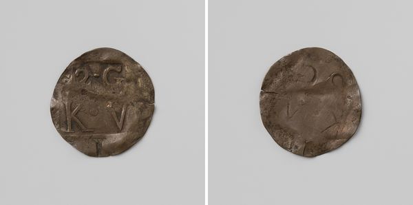 Editor: Here we have "Hersteld Lutherse Gemeente," a metal print from around 1791 by Rensen. It reminds me of an old coin, doesn't it? What do you see in this piece? Curator: Indeed. Looking closely, the material itself speaks volumes. The choice of metal lends it a sense of permanence, even austerity. Note the circular form; its unbroken contour immediately directs the eye, containing the composition. What visual elements stand out? Editor: Well, the letters "HLG" are pretty prominent. They’re engraved quite deeply. And there’s a faint horizontal line on the reverse side, almost like a scar. Curator: Precisely. Consider the relationship between these letterforms. Observe their individual shapes: straight lines versus curved segments, thick strokes contrasting with the negative space they define. These contrasting elements are not merely decorative; they dictate the internal structure of the composition. Does this not provoke certain aesthetic effects? Editor: I guess they give it a sense of balance, maybe even simplicity? It’s definitely not ornate. Curator: You’re moving toward the structural essence. Now, contemplate the visual effect created by that seemingly arbitrary line across the reverse. Does it interrupt the symmetry? Undermine it? Or, conversely, does it introduce an unexpected element of tension? Editor: I think it does add tension, yeah! It's like a rupture, making you question the completeness of the object. Curator: Excellent. See how through meticulous scrutiny of its form, line, material and composition, we unlock a nuanced experience beyond representational meaning? Editor: Definitely! I hadn't considered how much could be gleaned from just looking at those elements so carefully. Curator: Precisely, art transcends narrative; it engages our sensibilities through pure form and structure.