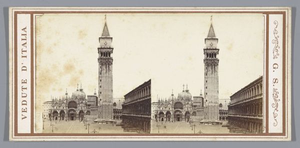 Editor: Here we have Carlo Ponti's "View of Piazza San Marco, the Campanile, St Mark's Basilica and Doge's Palace in Venice," a gelatin silver print from sometime between 1860 and 1881. It’s quite striking how still everything is, and it makes me wonder – how do you read a photograph like this? Curator: Well, I immediately think of the labor involved. Consider the precise chemical processes required for a gelatin silver print. This wasn’t just pointing and shooting; it involved skilled artisans meticulously controlling every step, from coating the glass plate to developing the image. Editor: Right, there’s a lot of invisible labor there. So the ‘stillness’ isn't just aesthetic but also speaks to the limits of photographic technology and the social constraints surrounding the image production itself? Curator: Precisely! It prompts questions about who could afford to commission such a print and what the consumption of these images meant for perceptions of Venice. Were they purely for artistic appreciation or did they also serve a commercial purpose, like attracting tourism? Editor: It’s easy to get lost in the romance of Venice and forget about those factors. Is Ponti commenting on this commercialism, or simply participating in it? Curator: It's likely both! And even the photographic paper itself—where was it produced? By whom? Every element has a story connected to resources, labor, and economics. The architecture signifies not just artistry but materials gathered and shaped. What do you make of its impact on the cultural perception? Editor: Viewing this through the lens of materials and labor definitely transforms my perspective; it goes beyond just appreciating a pretty cityscape. Curator: Exactly. Examining the means of production brings a whole new dimension to the artwork. It’s not just an image, but a product of its time and the social structures that enabled its creation and proliferation. Editor: I’ll definitely be paying more attention to the materiality and production processes from now on. Thank you!