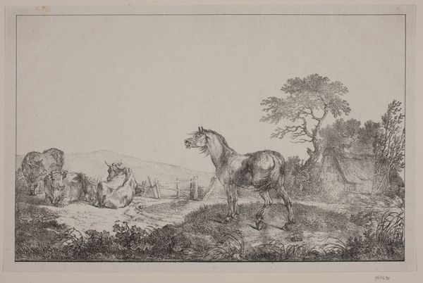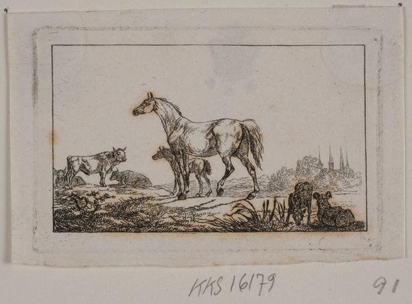 Curator: Here we have Christian David Gebauer's "En hoppe med sit føl", which translates to "A mare with her foal", from 1827. It’s a print, more specifically an etching. Editor: The scene almost floats; it is all delicately captured. There is such tender, nervous energy in those thin lines. It makes me want to reach out to them; they look so tactile, like I can run my fingers through their delicate outlines. Curator: It's interesting you say 'tactile' because an etching like this, while visually refined, is a product of real, physical labor. Think about the copper plate, the acid baths, and the controlled pressure— it transforms the whole production process into something more than just the representation of a pastoral landscape. Editor: Absolutely! This etching process really intrigues me. There is the transformation from this grounded process into something ethereal, as these graceful horses take center stage. But do you think the surrounding decorative border adds to the composition or detracts? Curator: It's typical of the time and echoes how prints were often framed and consumed, placing a work like this inside a broader cultural landscape, ready to be enjoyed at home. The frame brings attention to print as object of labour and capital. It’s the materiality that speaks volumes here, about how even the 'high' art is rooted in tangible production, even as its supposed to uplift the mind. Editor: Maybe so, but for me, the artist seems to want to highlight this natural scene. The affection between mare and foal is undeniable. But how to best convey this sort of emotional depth and intimacy when one uses etching as a tool? A cold calculation indeed. Curator: In a way, etching became a powerful tool, especially during the nineteenth century, as an efficient way to reproduce images widely, expanding the distribution of art beyond wealthy patrons. Editor: Perhaps the real story here isn’t just about horses, but about how art became accessible, in an increasingly material way. This changes what artwork gets reproduced, who gets to see it, who gets represented, and to what effect. Curator: Precisely! Each line etched here is not only a mark of aesthetic skill, but a testament to the labor that makes art circulate in society, creating these small windows into our historical experience. Editor: What was once confined to galleries and the elite, becomes shared in homes. It makes you wonder about those first encounters—how the world was being reconfigured through accessible image production! Curator: Exactly. Each stage of its making adds another dimension. Each reveals a history in consumption and circulation that goes beyond initial, sentimental connection with the image of a horse with a foal.