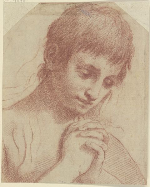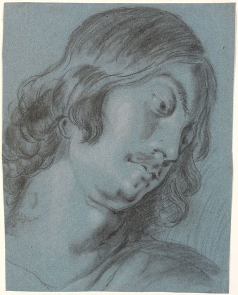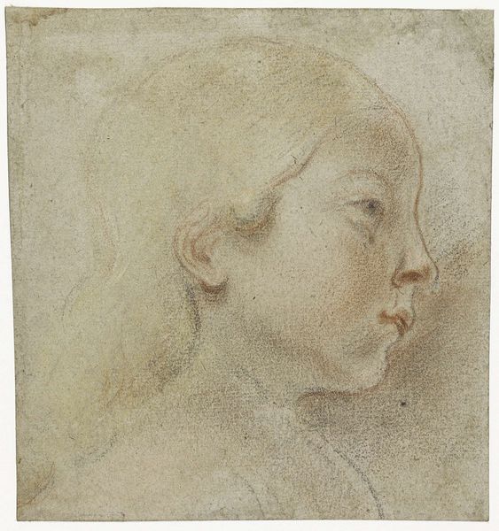 Curator: This drawing is entitled “Head of Youth Looking Down.” The artist is Matteo Rosselli, although we don't have a specific date of creation. It resides here at the Art Institute of Chicago, a study executed with pencil and chalk on paper. It strikes me with its somber quality. Editor: Yes, there’s a quiet melancholy in that averted gaze. You see the layered strokes of chalk and pencil, almost a visible record of the artist’s process and revisions. The very physical act of drawing becomes the subject in a way. What can you tell us about its broader artistic context? Curator: Rosselli was active during the Renaissance, and as such this head seems informed by the humanism that informed the era. His downcast expression could embody humility. Remember, portraits at the time were powerful assertions of identity, gender, race and status. I'm also struck by its relation to contemporary concepts around vulnerability, male emotion, the precarity of youth. Editor: I appreciate how this brings art history and theory into a real dialogue, considering questions of access, privilege, and visibility then and now. It certainly resonates. I think looking closely at the way the work was materially created—the paper, the pigment, the physical act of repeatedly and deliberately placing line after line is deeply affecting, knowing that this portrait must've been a social project. What choices in material are being made, for whom, under what conditions? Curator: It prompts us to look critically at what might otherwise appear as a straightforward, classical rendering. I hadn't considered its resonance with my social circles today! Editor: Agreed. It’s that layering of time periods, materiality and lived experience that allows us to find new meaning in such art. The piece remains vital, not a relic. Curator: Very true. The interplay between subject and method gives this artwork so much of its character, and I wonder how this might change depending on the sociopolitical climate around viewers. Editor: Absolutely. Seeing those traces, the residue of making and time itself – really does make you feel differently.