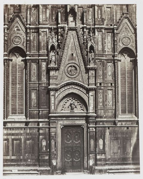 Editor: Here we have Charles Clifford's photograph, "Poort van de kathedraal van Granada," taken sometime between 1850 and 1863. The sepia tones give it such a timeless feel, almost like peering directly into the past. What strikes you most about this image? Curator: For me, it’s that silent conversation between the Islamic influences and the imposing architecture of the cathedral itself. Think about Granada’s history – the centuries of Moorish rule. Clifford, in capturing this doorway, is freezing a moment where those histories visibly collide, a dialogue etched in stone, almost daring us to unpack it. Don't you feel a certain… weightiness? Editor: I do! It feels like there are stories just waiting to be told within those walls. What about Clifford choosing photography for this? Wouldn't painting maybe convey the feeling more? Curator: Ah, but that's the kicker! Photography in the 19th century was still finding its voice. It’s both documentary – trying to record reality faithfully – and interpretive. Clifford's choices—the light, the angle—shape our understanding. It's not just *what* he photographed, but *how* he photographed it that speaks volumes. What I like to consider is how he has managed to extract poetry from such stern construction. Editor: I see! The photograph itself is making an argument. That’s a perspective I hadn't considered. Thanks! Curator: Exactly! Art always invites us to engage, to question, and to reimagine what we thought we knew. Thank you for your refreshing perspective, your curiosities, in turn, provoked new thoughts in me too.