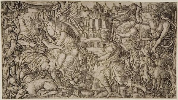 Editor: Here we have Nicolas Beatrizet the Younger's engraving, "Sacrifice of Iphigenia." It's incredibly detailed, a real narrative explosion on paper. The drama feels so heightened, almost operatic. What strikes you most about it? Curator: Oh, it's the dance between horror and...dare I say, necessity, that captivates me. See how Beatrizet frames it all within this classical architecture, Rome, no less! He's saying something about the foundations of civilization, isn't he? Built, perhaps, on uncomfortable choices. Editor: So, it's not just a historical scene, but a commentary? Curator: Precisely! And note the eagle swooping in—divine intervention waiting in the wings. Does it offer salvation, or merely a change of fate? Perhaps it's both, a grim reminder that even our best-laid plans are subject to forces beyond our control. Editor: Wow, I'll never look at Greek myths the same way. Curator: That's the magic of art, isn't it? To peel back the layers of story and find the raw nerve of human experience.